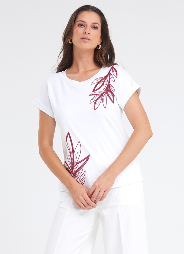 wit/framboos I ronde hals I aangesneden korte mouwen I geborduurde fantasie