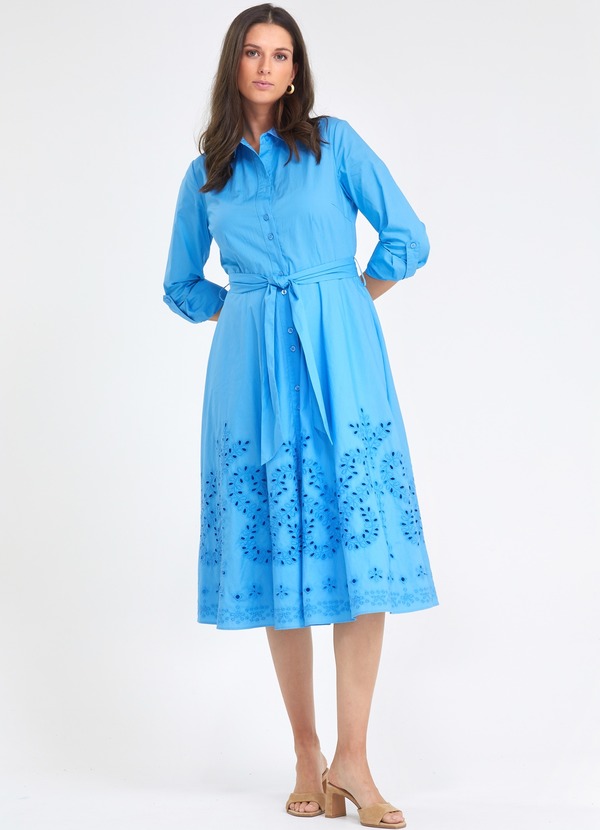 blauw I lange opsloofbare mouwen I knoopsluiting I steekzakken I riem uit dezelfde stof I broderie anglaise