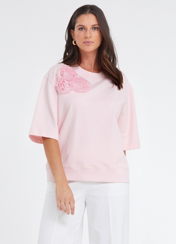 lichtroze I ronde hals I wijde korte mouwen I lage mouwinzet I geribbelde boorden I fantasiebloemen in tule