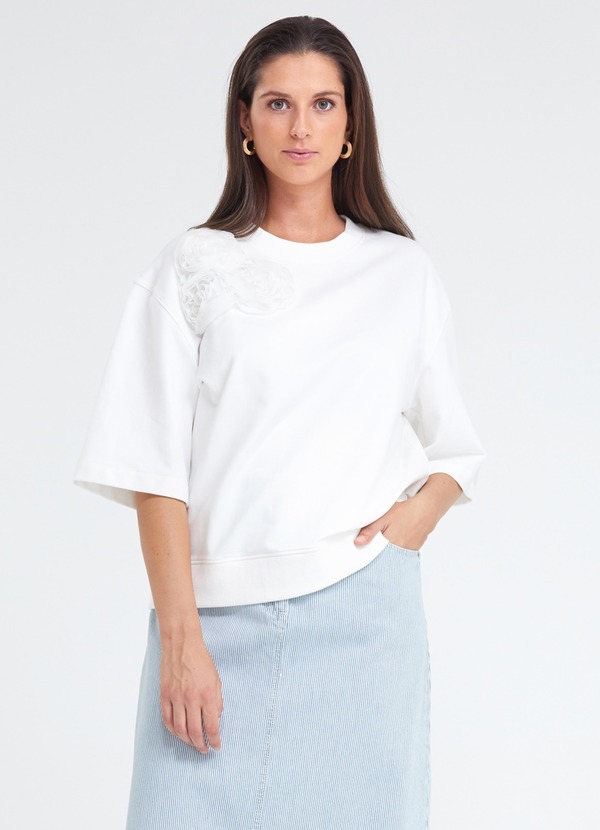 wit I ronde hals I wijde korte mouwen I lage mouwinzet I geribbelde boorden I fantasiebloemen in tule